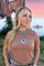 Want to add a bit of edge to your western style? Made in a mocha/taupe color, comfortable material, this top features stunning studs around the neck and shoulders. The Starry Stud Tee is easy to dress up and down. Pair with a duster or by itself!